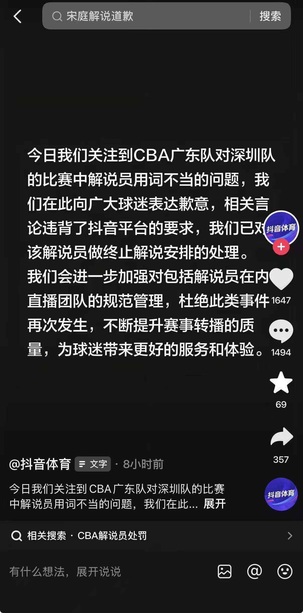 爱体育,爱体育官方网站,爱体育APP下载1月7日深夜,抖音体育官方账号在社交平台发文称,关注到CBA广东队对深圳队的比赛中解说员用词不当的问题,在此向广大球迷表达歉意,相关言论违背了抖音平台的要求,已对该解说员做终止解说安排的处理。
