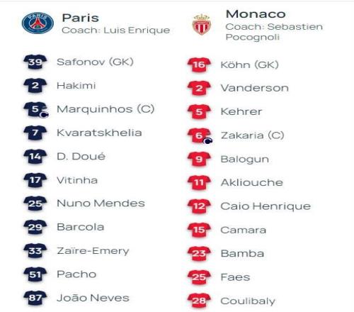 北京时间2月26日,欧冠淘汰赛附加赛次回合巴黎圣日耳曼主场对阵摩纳哥,赛前公布的首发名单扎伊尔-埃梅里代表PS...