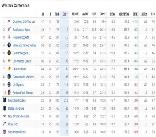 最新的西部排名:雷霆、马刺、火箭、森林狼、掘金、湖人、太阳、勇士、快船、开拓者、灰熊、独行侠、鹈鹕、爵士、国王。