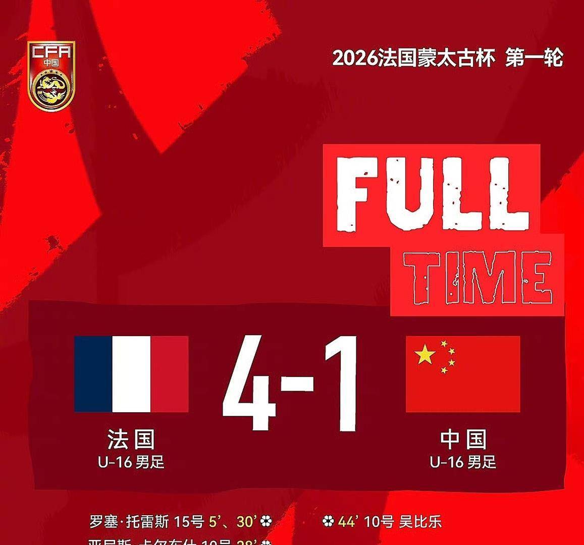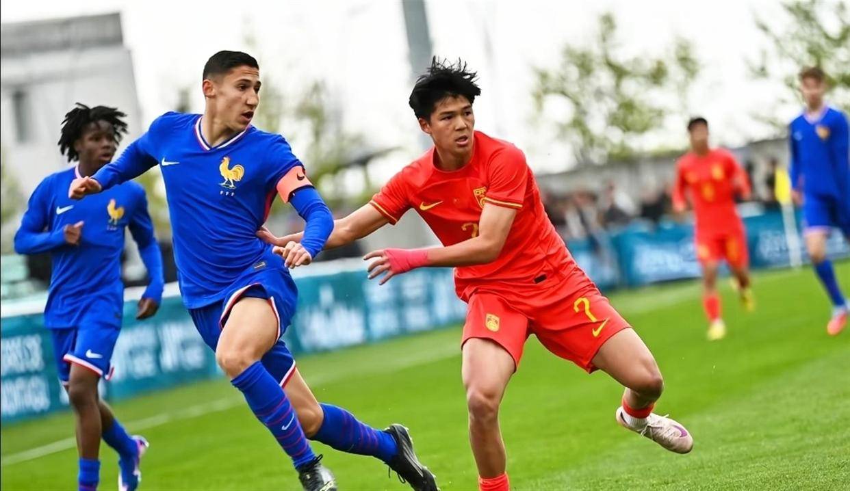 反观我们的国少队,这次蒙太古杯之旅,从一开始就被扔进了“死亡之组”。 首战对阵法国,主教练排出的阵容里,有刘凯源、李东宸、张林峒这几个在海外踢球的小将,明显是想用他们的比赛经验,跟东道主拼一下开局。 战术也确实激进,上来就高位逼抢。 但现实很骨感,法国队一次简单的长传反击,我们的后卫线分钟就丢球。 紧接着,两次角球防守,禁区里完全漏人,眼睁睁看着对方把球顶进。 半场0-3,比赛其实已经结束了。 下半场刘凯源在边路突破后传中,助攻中锋吴比乐顶进一个,算是挽回些许颜面。 但最后时刻自己后场传球失误,又被法国队打进第四球。 1-4的比分,把欧洲青训强国和我们在青少年阶段的身体、技术、战术理解上的全方位差距,暴露得一清二楚。